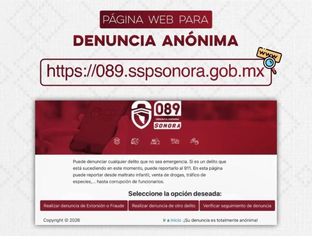Las y los ciudadanos que deseen denunciar un delito de forma anónima pueden hacerlo los 365 días del año a través de la línea 089, app 089 Sonora y desde el portal https://089.sspsonora.gob.mx/.