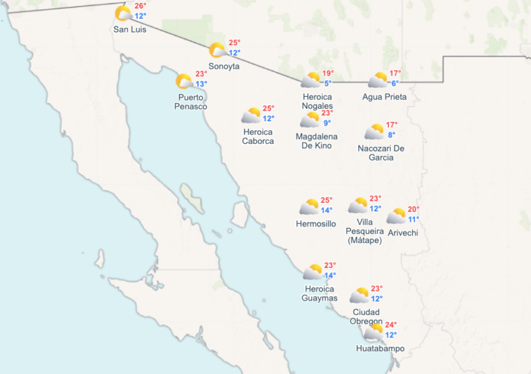 - Ciudad Obregón: Máxima de 23 °C y mínima de 12 °C.
