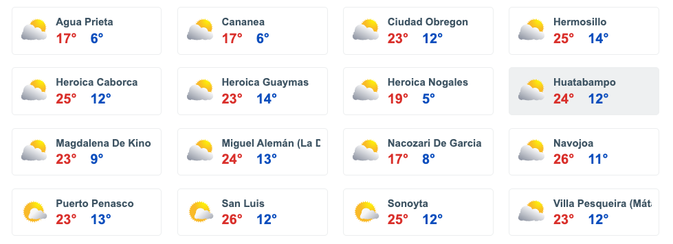 - Navojoa: Máxima de 26 °C y mínima de 11 °C.
