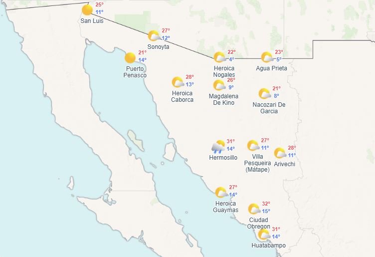 En la franja fronteriza, el panorama es ligeramente más frío. En Nogales, las temperaturas oscilan entre una mínima de 5 °C y una máxima de 19 °C, con cielos que alternan entre claros y nubes. Agua Prieta reporta condiciones similares, alcanzando los 22 °C por la tarde tras un amanecer gélido. En estas zonas, la probabilidad de lluvia es mínima (cercana al 5%), aunque no se descarta que la nubosidad aumente hacia el final del día por la influencia de corrientes de aire provenientes del suroeste.